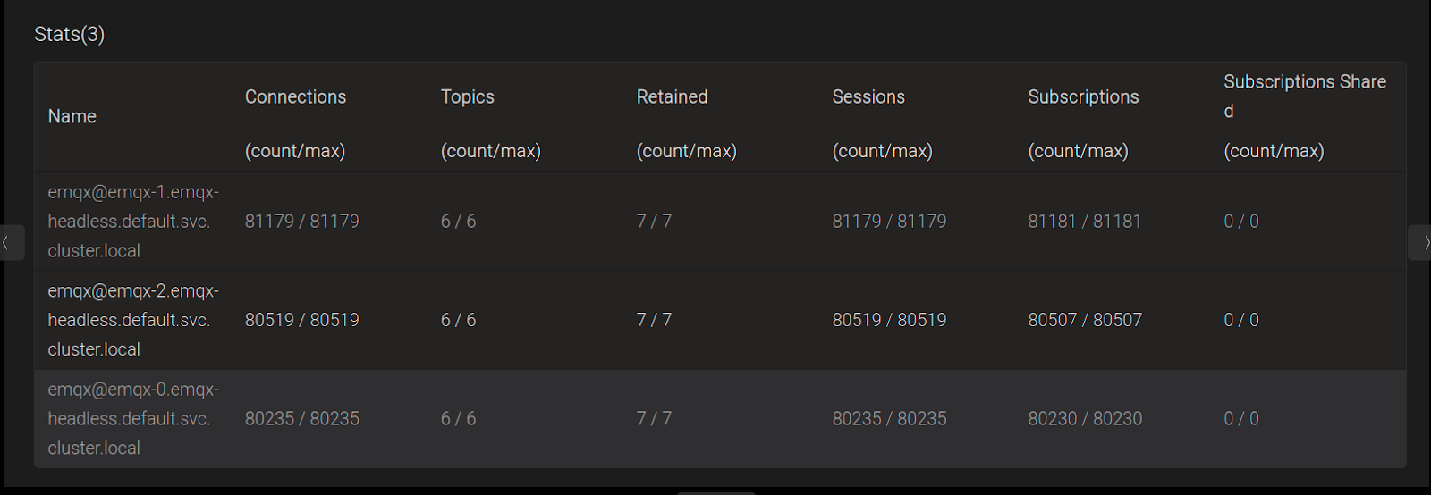 The “Connections count” shows the current active connections on each EMQX Broker Pod and it keeps on growing during the testing.